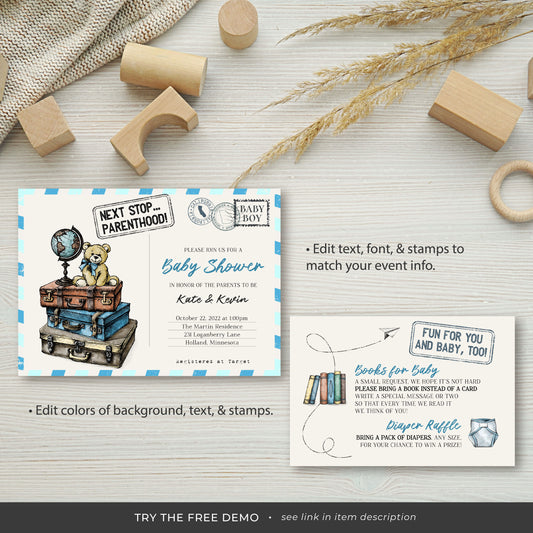 Baby Shower Invitation Set, Vintage Travel, Editable, Printable, DIY Invitation